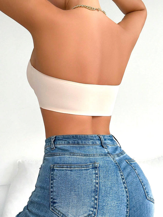 Simple Solid Front-Closure Hook And Eye Strapless Wireless Bra Beige